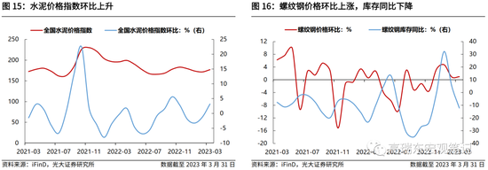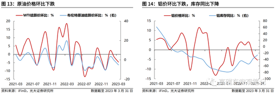铜价、铝价环比下跌。2023年3月以来,铜价环比下跌1.38%,跌幅相对上月扩大0.89个百分点。库存同比下降7.59%,降幅相对上月缩窄6.52个百分点。铝价环比下跌5.35%,跌幅扩大2.47个百分点。库存同比下降25.93%,降幅缩窄10.8个百分点。