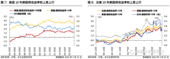 美国10年期国债收益率上行,通胀预期上行。3月31日,美国10年期国债收益率收于3.48%,较上周末上行10个基点;法国10年期国债收益率较上周末上行12个基点至2.78%;德国10年期国债较上周末上行32个基点至2.35%。美国10年期国债隐含的通胀预期较上周末上行10个基点至2.32%,实际收益率较上周末持平。