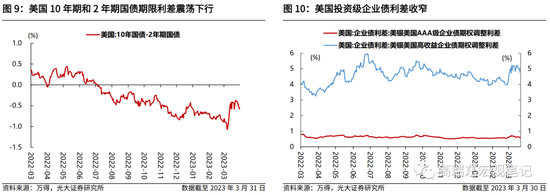 美国10年期和2年期国债利率期限利差震荡下行。本周美国10年期和2年期国债期限利差震荡下行,最终收于-0.58%,较上周末下行20个基点。截至3月30日,美国AAA级企业期权调整利差较上周末下行5个基点,为0.58%,美国高收益债期权调整利差较上周末下行48个基点至4.74%。