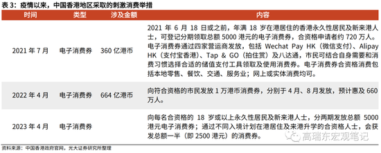 (4)中国香港:发放电子消费券,适用于零售、餐饮和服务业。2021-2023年,中国香港地区共发放三轮电子消费券,向市民分别发放5000、10000、5000/2500港币消费券,用于本地零售、餐饮、交通等服务业。其中,第二轮发放规模最大,共计664亿港币,约占2022年GDP的2%。