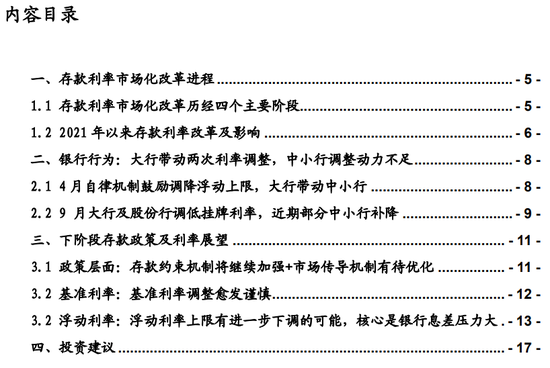 展望下阶段:1、政策层面存款约束机制将继续加强,同时市场传导机制有待优化;2、预计对存款的基准利率短期调整会比较谨慎,有制约因素;但针对目前银行负债端刚性问题,浮动利率上限有进一步下调的可能;3、银行存款利率预计会缓慢下行。