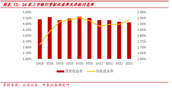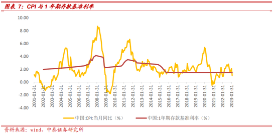 下阶段存款政策及利率展望。政策层面:一是存款约束机制将继续加强;二是市场传导机制有待优化。利率层面,一是基准利率作为压舱石,在当前环境下调整愈发谨慎,在2015年之后,一年期存款基准利率保持1.5%至今,并未随CPI变动。二是浮动利率上限有进一步下调的可能,核心是银行息差压力大。截至2022年末,整体商业银行净息差1.91%,较21Q3下行3bp,较2021年末下行17bp;从已披露年报的24家上市银行来看,年化累积净息差2.08%,较1H22下降3bp,存款付息率较1H22上升4bp。负债端刚性影响银行降低信贷成本的积极性,监管仍有动力进一步压降银行负债成本。