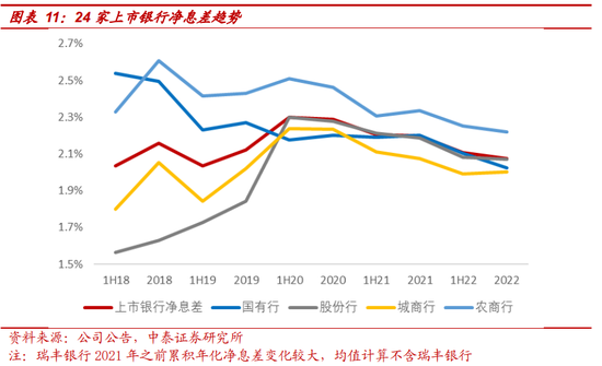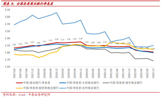从银保监会披露的全国银行净息差数据来看,整体看商业银行息差压力较大,截至2022年末,整体商业银行净息差1.91%,较21Q3下行3bp,较2021年末下行17bp;除农商行22Q4有小幅回升外,其他均有不同程度下行,城商行压力最大,净息差仅为1.67%。