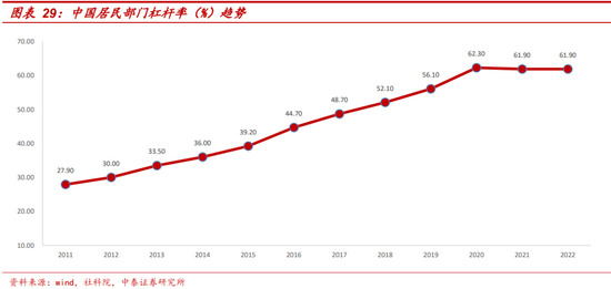首先是从居民债务/GDP来看,我国居民杠杆率在世界范围内处于中游水平。根据国际清算银行披露的各国杠杆率(居民债务/GDP)来看,截止至2022年6月底,我国居民杠杆率为61.6%,在世界范围内处于中游水平,相较于发达国家并不算高,且低于全部报告国的平均值。从社科院披露的年度杠杆率(历年与国际清算银行披露的杠杆率差距不大)来看,我国居民杠杆率在20年末以来已维持平稳,且2021-2022维持在61.9%,较2020年峰值下降0.4个百分点。但居民债务/GDP该指标未考虑住房制度、社会保障制度等差异,各国直接横向简单对比并不能反映真实的国民债务负担情况。