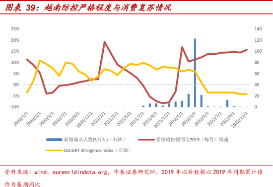 越南:2021年10月逐步放开,零售销售同比2019迅速拉升并持续一个季度,3月全面放开,当月达到新增感染峰值后回落,8月新增病例有所反复,整体看全面放开后零售销售同比稳步增长。