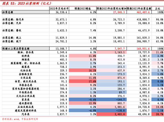数据选择:根据数据可得性,可根据历史数据估测2023社零总额,以及其中的汽车、餐饮、线上、线下社零规模,其他细项只能通过限额以上商品零售披露的细项进行测算。计算方法:首先通过观察社零同比增速趋势,通过历史数据估测2023年社零恢复到正常水平的增速,假设以2019-2021年中不受疫情影响月份(剔除2020年1-3月份)的社零同比平均增速作为2023年的增速预测,经测算社零平均增速为6.2%。其次根据月度平均增速以及2022年月均社零规模,计算2023年月均社零规模3.88万亿,在此基础上,全年社零总额约同比增2.7万亿,总额约为46.54万亿,其中汽车5万亿,餐饮4.7万亿;线上线下来看,线上社零1.6万亿,线下社零3.1万亿。