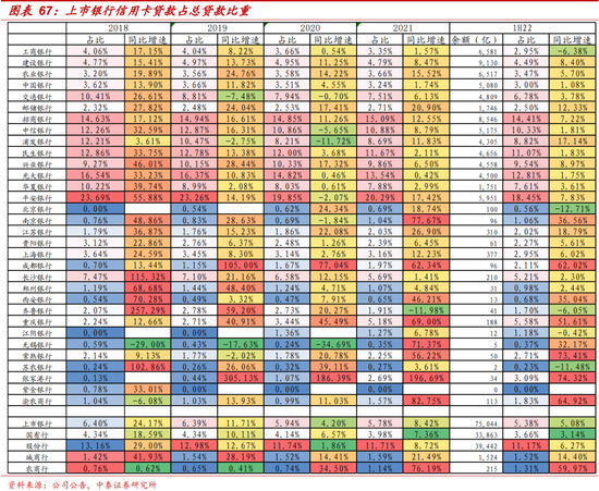 以上场景均是信用卡重点场景,信用卡告别跑马圈地,进入精耕细作。据人民银行统计,我国信用卡累计发卡量由2010年2.3亿张翻两番至2021年8.0亿张。我国信用卡行业离发卡量天花板越来越近。相应的,其增速已从2017年26.5%以近乎连年腰斩的方式下降至2021年2.8%,昭示着信用卡“跑马圈地”时代的终结,存量信用卡业务占比高、交易额高的银行将有望持续保持竞争优势,如招行、平安、光大、兴业、邮储等。而本地餐饮、商超、娱乐、打车出行的复苏或同时利好一部分与本地消费场景有深入合作的城农商行,招行管理层在2022年年报业绩交流会上公开表示信用卡交易数据回暖明显
