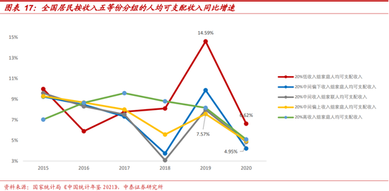 (1)第一个角度,按照国家统计局口径的低中高收入人群观测(数据更新至2020年底):高收入人群人均可支配收入净增量是低收入人群的十倍,低收入人群人均可支配收入受疫情影响最大,2020年收入同比增速下滑幅度高达8个百分点。