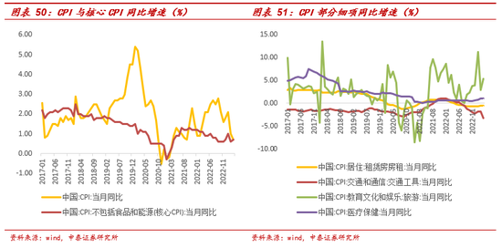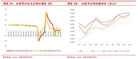 社零方面:疫情全面放开后的一个月后社零降幅收窄,2023年1-2月社零同比增3.5%,超过wind一致预期,扭转了2022年10月以来连续三个月下降的趋势,餐饮复苏明显。从2020-2022年维度看:社零增速与疫情管控基本程反向变化,2022年社零总额同比下降0.2%,12月单月社零4.1万亿,同比下降 1.8%,在疫情放开的一个月后降幅便同比收窄。从2023年数据看,1-2月社零总额7.7万亿,同比增长3.5%,扭转了2022年10月以来连续三个月下降的趋势,在上年同期较高基数基础上持续恢复。细项看,1-2月,商品零售6.9万亿,同比增2.9%;餐饮收入0.8亿,同比增9.2%(2022年全年下降6.3%)。春节的报复性线下消费贡献较多:(1)春节餐饮方面:据中国烹饪协会开展的“兔年春节期间重点餐饮企业经营情况调研”数据显示,除夕至正月初六(1月21日—27日)受访餐饮企业营业收入与去年春节相比上涨24.7%,与2019年春节相比上涨1.9%;客流量与去年春节相比上涨26%,与2019年春节基本持平。(2)春节商超方面,根据万达官微数据显示,春节期间(除夕至初六)全国 480 座万达广场客流 1.6 亿人次,销售收入 126.8 亿元,其中可比万达广场同比2019 年客流增长 15%,销售额增长 29%。(3)春节电影方面,2023年初一至初五点评票房达58万,高于2022年和2019年。(4)春节旅游方面,春节期间国内旅游人次和旅游收入分别恢复至 2019 年同期的90%和 70%。春节假期,国内旅游人次 3.1亿人次,同比增 23%,恢复至2019 年同期的 90%,远高于元旦的43%;旅游收入3758亿元,同比增30%,恢复至2019年同期的73%,远高于元旦的35%;旅游客单价涨幅明显,接近于2019年同期持平。关于2023年更为具体的消费细项分析详见后文。