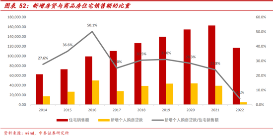 一是历史角度看居民购房贷款有缺口,不排除有居民利用非房贷款补充缺口。新增居民购房贷款占商品房住宅销售额的比重在2017-2021五年间维持在24%-31%之间:自2012年以来,新增居民购房贷款占商品房住宅销售额的比重不断抬升至2016年50%的高点,后随着监管趋严,比重回落到2018-2020年的30%左右,近两年下降更为明显,截至2022年3季度仅为17.7%,2022年全年仅为4.1%。房贷仍有缺口:按照前文假设,一套二套按揭累计首付比例约33%。2021年住宅销售额16万亿,对应首付5.28万亿,同年新增购房贷款为3.9万亿(2021年末上市银行较年初新增个人按揭3.4万亿),首付款+购房贷款总计为9.18万亿。2022年住宅销售额8.7万亿,对应首付款2.9万亿,新增购房贷款余额仅为0.48万亿,首付款+购房贷款总计仅为3.4万亿。由于数据可得性、未考虑全款买房、首付比例不精确、以及提前还贷等情况,以上观测缺口可能偏大,但科粗略判断实际房贷与真实需求之间其实仍有缺口,在消费贷款利率不断下行的情况下,不排除有非房贷款继续流入房市。