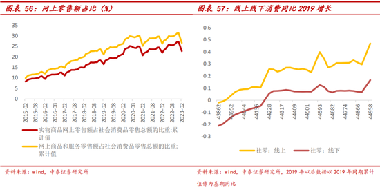 线下:根据前述测算,主要的消费增量还是由线下消费提供,线下场景复苏程度更大影响消费提升空间,线下消费贡献体量仍超过65%,2023年初受线下场景复苏带动,线下占比有所抬升。