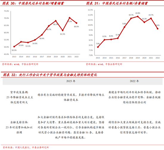 基于此,我们从我国居民的季度收支角度,更为高频地观测居民债务负担情况,三个角度说明居民偿债压力已经出现边际缓解,居民仍有加杠杆的空间。测算方法:根据季度可得的居民购房贷款、其他非房贷款、居民人均可支配收入、居民人均消费支出等数据,假设房贷久期20年,房贷以外的中长期贷款久期为10年,利率采自央行《货币政策执行报告》,计息方式为等额本息,增量储蓄=可支配收入-消费支出,存量储蓄直接采用央行披露的住户存款。以此测算居民各项债务的季度还本付息额,四季度相加即可得年度各债务还本付息额,相较于直接按照年度数据测算,季度频率测算缩小了提前还款带来的误差。测算结果:增量储蓄角度,居民债务支出占居民增量储蓄比重低于2019年水平。观测历年还本付息额/增量储蓄,在2019年之前中国居民债务支出负担越来越重,但近年来有所波动,2022为66.6%,低于2019年的68.2%。存量储蓄角度,居民债务支出占居民存量储蓄比重下降至6年来最低水平9.6%。观测历年还本付息额/存量储蓄,2022年为9.6%,是2017年以来的最低值。居民季度还本付息增速来看,自22年三季度以来开始低于居民可支配收入增速,这是2016年以来的首次边际缓解,这主要依赖于还本付息增速的持续下降,得益于居民降低负债以及货币政策发力的多重影响。在扩内需、促销费的大背景下,货币政策或将继续发力降低居民融资成本。得益于货币政策的持续发力,21年三季度以来各项贷款利率较2020年均出现了较快的下降,并维持下降趋势,这也应对了居民还本付息增速的持续下降;而23年央行工作会议针对货币政策整体基调指出要“多举措并举降低市场主体融资成本”,相比2022年工作会议中的“推动企业综合融资成本稳中有降”,2023年降成本范围有望有所扩大,或继续通过引导LPR下调、调整住房贷款利率下限等方式进一步降低居民端购房成本以及非房信贷成本,均有利于进一步减轻居民债务负担,居民或仍有加杠杆的空间。