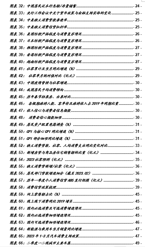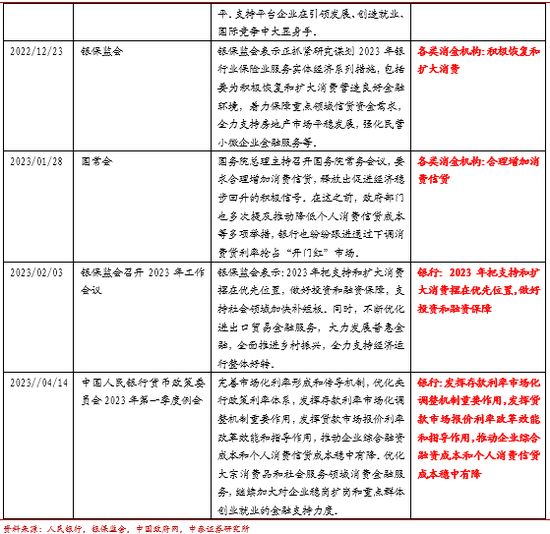 5、2022年年末以来,中央把扩内需、促销费放在更重要的位置,政府明确提出要合理增加消费信贷。 2022年:12月14号中央发文《扩大内需战略规划纲要(2022-2035年)》,要求全面促进消费,加快消费提质升级。12月16号中央经济工作会议表示,大力发展数字经济,支持平台企业在引领发展、创造就业、国际竞争中大显身手。12月23日银保监会表示,要为积极恢复和扩大消费营造良好金融环境,着力保障重点领域信贷资金需求。2023年:1月28号国常会要求合理增加消费信贷。2月3号银保监会表示,要把支持和扩大消费摆在优先位置,做好投资和融资保障,支持社会领域加快补短板。4月14号人行货币政策委员会2023年第一季度例会表示,要发挥存款利率市场化调整机制重要作用,发挥贷款市场报价利率改革效能和指导作用,推动企业综合融资成本和个人消费信贷成本稳中有降。