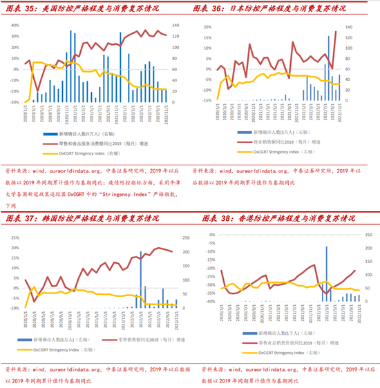 韩国:2021年11月防疫逐步放松以后,零售消费额同比2019波动抬升超过3个季度,2022年4月全面放开,8月出现放开后新增感染峰值,零售消费额同比自2022年7月以来随着感染病例抬升而有所回落。