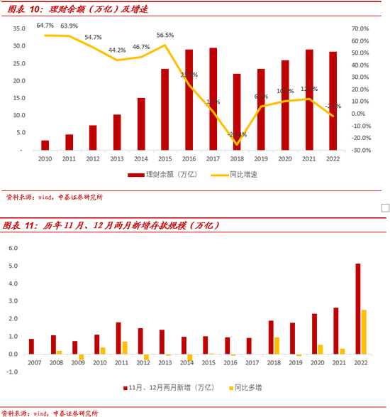 银行理财以其稳健的特征,一直被居民当作存款的稳健的替代品,因此2022年因减配理财而产生的储蓄不容忽视。自2016年以来监管开启金融去杠杆,先是在2016年7月颁布《商业银行理财业务监督管理办法(征求意见稿)》,后续在2017年3/4月颁布“334”整改文件,并在同年三季度陆续针对资管行业资金池、刚性兑付、多层嵌套、监管套利等问题进行探讨,年底颁布资管新规。理财规模自2017年增速降至1.7%,2018年大幅下降7.5万亿,此后保持平稳增长。单独观察2022年11-12月两月存款增量,2022年11/12两月增加5.1万亿(占全年增量的29%),同比多增2.5万亿(占全年同比多增的32%),远高于历年同期,对应同期11-12月债市波动导致理财净值下跌和理财赎回,两者有较大相关性。基于此我们测算由减配理财而产生的储蓄规模。
