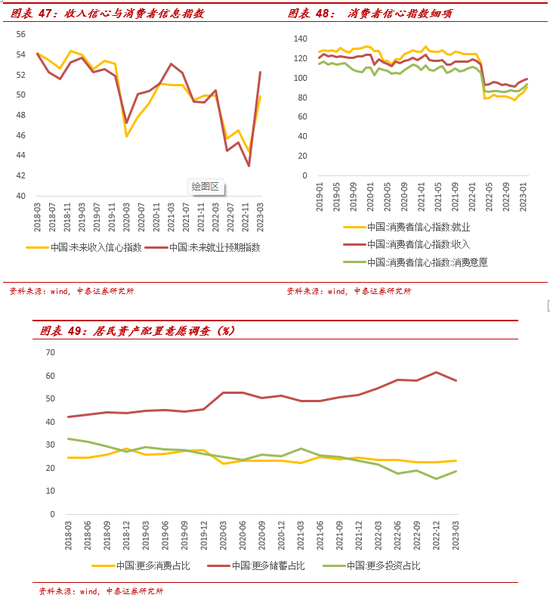 23Q1城镇储户调查结果方面,居民消费意愿回升0.4pct至23.2%,趋势止跌回升。居民就业预期和收入信心指数在3月分别大幅提升9.3个点和5.5个点至52.3%和49.9%,整体收入和就业预期趋稳。