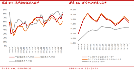 三是酒店:在旅游和出差的带动下,酒店也有显著回暖。境外疫后规律:如我国香港等分步放松的地区,整体复苏节奏趋缓,而韩国、印度等快速放松的国家,则表现出更快的复苏速度甚至短期出现报复性反弹。境内多家酒店集团数据显示恢复较好:首旅如家官网数据显示,2023年1-2月,其以北京、上海等为代表的一线城市酒店出租率同比增长超30%。而以杭州为代表的新一线城市也增幅明显,酒店出租率同比增长达10%以上。在聚焦商旅出行的企业客户方面,2023年1-2月GMV同比增长达 117.61%,间夜同比增长达98.65%。锦江国际2022年财报显示其2022年全年RevPAR为2019年度的72.37%,较2021年度降低17.25%。但1-2月整体平均RevPAR已分别恢复至2019年同期的88%和115%。