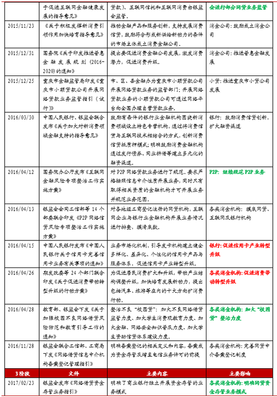 2、2014-2016鼓励创新期:这期间互联网经济快速发展,大型电商、消费分期平台、网贷平台、P2P 平台、小贷等快速布局消费金融,监管政策多集中于鼓励金融创新、普惠金融、消费扩大和升级;同时对P2P、校园贷进行一定的规范。