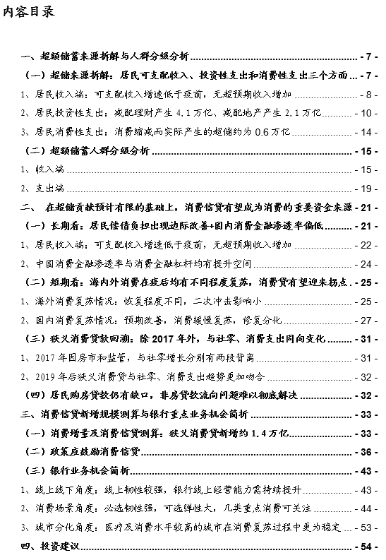 政策把“恢复和扩大消费”摆在优先位置;我们从银行的角度,关注钱来自哪里?1、存款持续高增,对存量超额储蓄存款进行拆解分析,向消费的释放空间有限。2、居民整体偿债负担出现边际改善,且国内消费金融渗透率偏低,仍有加杠杆空间;同时海内外经验表明,消费意愿在疫后均有不同程度的复苏;所以,消费信贷还是有望成为消费的重要的资金来源。3、收入预期目前影响居民消费,消费信贷是市场未来值得重点关注的指标,反映居民对未来的信心。消费信贷值得未来政策发力,仍是是银行重点布局的业务之一。