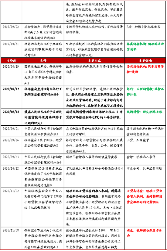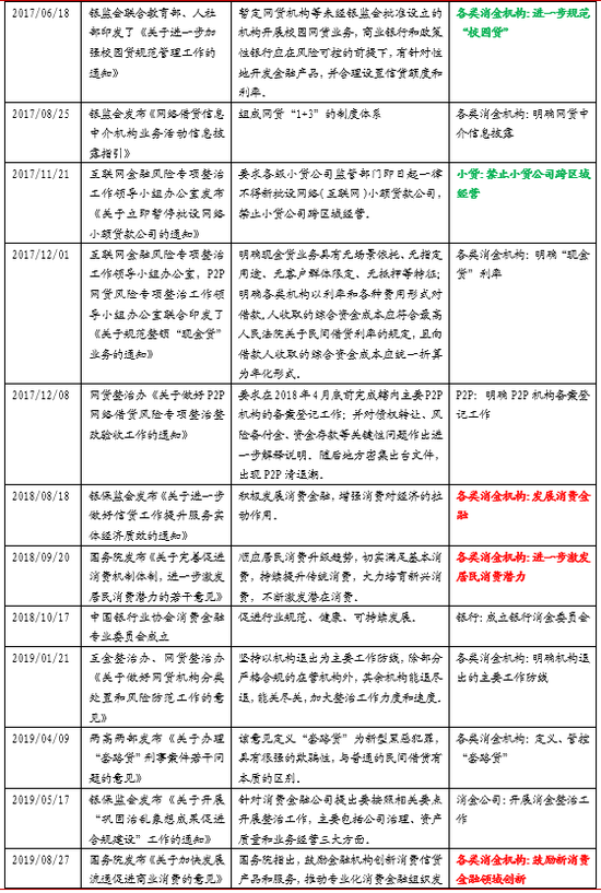 3、2017-2019消费贷监管趋严,同时发文支持消费:2017年特别是年末以来迎来强监管,针对校园贷、联合贷款、现金贷、P2P、网络小贷进行严格整治,出现P2P清退潮。2017年同时房地产市场也迎来强监管,限购限售政策频出,房贷承压,消费贷、经营贷流入房市。2018年下半年发文支持信贷服务实体,激发消费潜力。2019年首次明确超过36%的实际年利率为非法放货行为。