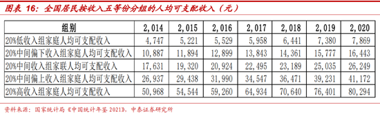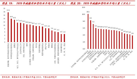 从同比增速看,低收入人群收入弹性大,受疫情影响更大。一方面,按照五等份分组人均可支配收入指标观测,2020年各收入组可支配收入同比增速均出现不同程度的下滑,下滑幅度基本由从最低收入组到最高收入组依次递减,由于基数较低,低收入组历年变化幅度较大,2020年增速下滑高达8个百分点,而高收入组仅3个百分点。另一方面,疫后餐饮酒店、商超电影、居民服务等基于消费场景复苏或对低收入人群收入提振较大,但低收入人群基数较小,能贡献于消费的总量有限。私营企业平均薪资相比非私营更低:根据《中国统计年鉴2021》,截至2020年,全国就业人数7.62亿,其中城镇4.2亿,乡村3.4亿,城镇就业人口中非私营单位就业人口1.7亿,占全国总就业人口的22%,而该部分就业人员平均工资9.7万,是城镇私营就业人员平均工资(5.8万)的1.7倍。进一步拆分私营企业、非私营企业中不同行业人员平均薪资:私营企业中,农林牧渔、住宿和餐饮、水利环境和公共设施管理、居民服务维修和其他服务、教育位列倒数前五名,非私营企业中,农林牧渔、住宿和餐饮、水利环境和公共设施管理、居民服务维修和其他服务、建筑位列倒数前五名,以上行业均是低收入人群重点覆盖行业,而正由于低收入人群可支配收入弹性更大,疫后覆盖相关消费场景的行业复苏或对提升低收入人群的收入水平有较大贡献,但从工资总额(国家统计局仅披露了非私营工资总额)简单来看,低收入人群所处行业整体收入基数仍较小,能贡献于消费的总量或有限。
