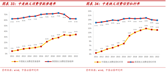 中国消费金融渗透率、消费信贷杠杆率均低于美国。测算中美两国的消费金融渗透率,用狭义消费贷款与社零总额比重代表消费金融渗透率,中国消费金融渗透率不到40%,而美国一直维持在67%以上;用狭义消费贷款与GDP比重代表消费金融杠杆率,中美近三年来均有所下滑,中国为14.2%,也低于美国的18.8%。