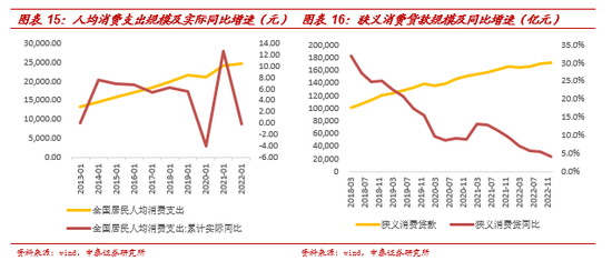 除2017年外,狭义消费贷与人均消费支出、社零基本维持正相关,特别是在2019年以后增长趋势更加吻合。一是2019年末疫情爆发,消费贷款增速迎来十年最低点。2020年全年消费贷款同比增速仅有9%,达2014-2020年的最低点。二是2021年得益于疫情防控较好,消费贷款同比增速有所恢复。2021年前三季度消费贷款同比增速均维持在10%以上,全年同比增9.5%。三是2022年疫情反复,消费贷款增速再次下滑。2022年消费贷款同比增速仅为4.1%,达2014年以来的最低点。在疫情影响逐步消退后,伴随着消费的逐步回暖,消费贷有望迎来复苏拐点。