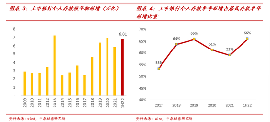 该部分超额储蓄来源主要从收支两条线拆解,从居民可支配收入,投资性支出和消费性支出方面去拆解。上市银行个人存款数据方面,从绝对值来看,上市银行1H22新增存款规模(6.8万亿)已超过2021年年度新增规模(5.8万亿),逼近2020年全年新增规模(6.9万亿)。从比重来看,上市银行个人存款单年新增占居民存款单年新增比重近年来基本维持在60%以上,可见超额储蓄如何释放,对下阶段银行经营有较大影响。