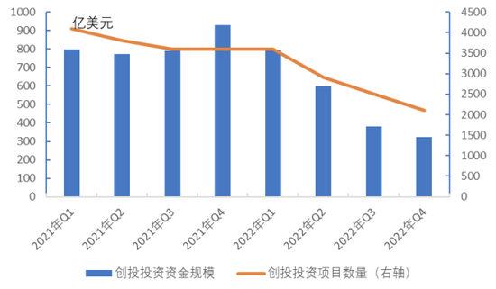 二是受创投企业亏损影响,2022年创投企业投资规模也出现明显收缩。根据CB Insights数据,2022年全球创投企业投资规模约4151亿美元,较2021年下降约35%。其中,美国企业获得的创投资金规模由2021年的约3290亿美元下降至2022年的约2090亿美元,降幅接近40%。尤其是从季度来看,2022年四季度美国企业获得的创投投资规模仅约324亿美元,较2021年同期跌幅超过65%。今年第一季度创投资金同比又进一步下降,出现腰斩。