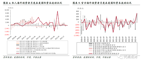 私人外资更趋谨慎,官方外资全面加仓。2月份,剔除银行对外负债变动后,私人海外投资者在美减持证券资产258亿美元,结束了连续16个月净增持。其中,私人外资净减持165亿美元美股,减持规模环比下降18%,净减持其他可转让证券536亿美元,减持规模创下2008年10月“雷曼破产”以来新高,是本月外资净卖出美元资产的最大贡献,但同时净增持71亿美元企业债券(见图表4)。官方外资与私人外资截然相反,净增持32亿美元美股,同时净减持0.6亿美元企业债券(见图表5)。同期,美国投资者和上月一样继续净增持80亿美元海外股票,但净减持153亿美元海外债券,合计净减持74亿美元海外证券资产,减持规模环比扩大73亿美元。除了风险资产互换筹码以外,私人和官方外资最大的区别在于债券市场。本月,私人外资偏向短期债券,净增持76亿美元中长期美债,同比和环比均下降了92%,创下2021年11月以来新低;同时净增持了182亿美元短期美国国库券,同比增加了11%,而上月为净减持206亿美元。与之相对的是,官方外资偏向中长期债券,净增持了480亿美元中长期美债,创下2013年2月以来新高,而去年同期和上月分别净减持132亿美元和461亿美元;同时净增持73亿美元短期美国国库券,增持规模同比和环比分别下降了37%和33%。此外,私人和官方外资分别净增持了112亿美元和30亿美元机构债券。