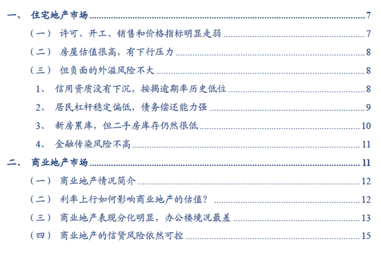 相对简单的住宅房地产市场情况是:尽管因利率上行和房价涨至历史高位,去年以来住宅市场明显走弱,建筑许可、开工、销售和价格快速下降,但其衍生风险较小,主要有四个原因:一是信用资质没有下沉,二是居民杠杆稳定偏低,三是房屋库存仍在低位,四是衍生的金融传染风险可控。