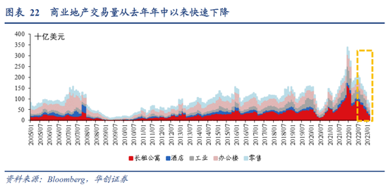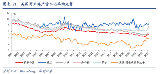 商业地产估值模式相对清晰,为净营运收入/资本化率,所以联储加息对商业地产的影响大概有三个渠道:1)估值,资本化率大体跟随长端利率走势。2)收入,净营运收入主要来自租金,加息削弱经济增长,商业地产需求下滑,租金下降。3)融资,利率上升,银行信贷标准收紧,商业地产融资环境恶化。