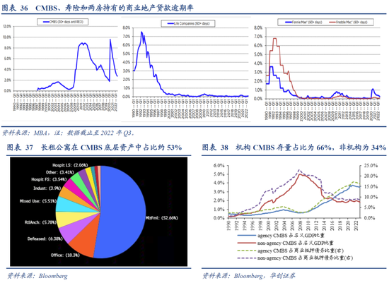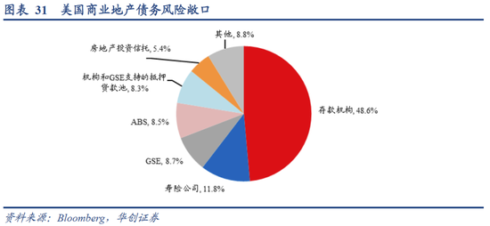 GSE、CMBS、机构和GSE支持的抵押贷款池持有的商业地产贷款敞口占比在8-9%之间。GSE和机构支持的抵押贷款池,风险偏好较低,这类商业地产贷款的底层资产大多是长租公寓,资产质量普遍较好,逾期率也很低,不到0.3%。即便是逾期率相对较高的CMBS(截止22Q3为2.8%),在次贷危机之后,其发行条件更为严格,对贷款价值比和偿债保障比率的要求更高,并且发行主体也主要从非机构转变为两房,金融衍生风险也不高。