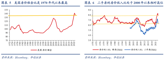 疫情后联储货币政策大宽松叠加供给受限,美国房价爆发式上涨,涨幅远高于房租和收入,以房价租金比和房价收入比衡量,住房市场估值明显上行,即便近半年房价有所下跌,但估值压力依然较大。