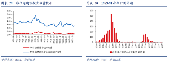 商业地产的风险主要集中在由信贷资产质量引发的金融衍生风险上。相比于住宅地产对居民财富和消费的潜在直接影响,商业地产的主体更为多样,对基本面的传导链条更长,本身的投资体量也较小,其最大的风险主要在于因信贷资产质量引发的金融衍生风险。实际上,在两大银行倒闭后,市场对商业银行的担忧也主要体现在商业地产贷款敞口上,尤其是办公地产。毕竟此事早有前例,在1989-1991年的中小银行倒闭潮中,商业地产贷款损失是关键因素。