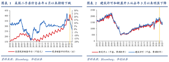 首先来看相对简单一些的住宅房地产市场的情况,核心结论是:尽管由于利率上行和房价涨至历史高位,去年以来美国的住宅市场明显走弱,体现为建筑许可、开工、销售和价格的快速下降。但我们认为,其负面的衍生风险相对较为有限,体现为四个方面,一是信用资质没有下沉,二是居民杠杆稳定偏低,三是房屋库存仍在低位,四是衍生的金融传染风险可控。