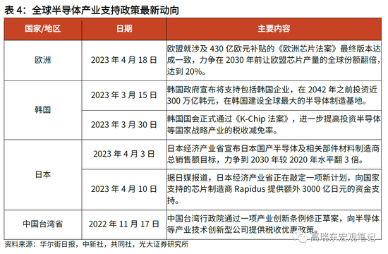 ● 韩国方面,2023年3月15日,韩国政府宣布将支持包括三星在内的韩国企业,在2042年之前投资近300万亿韩元(约合2300亿美元),在韩国建设全球最大的半导体制造基地。2023年3月30日,韩国国会正式通过旨在扶持韩国本土半导体产业的《K-Chip法案》,旨在提高投资半导体等国家战略产业的税收减免率。其中,大中型企业的税收减免率将从8%提高到15%,中小企业的税收减免率从16%提高到25%。