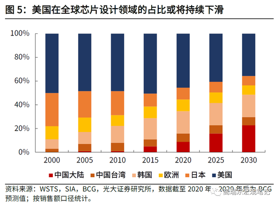 三是,专注生产环节就足以维持和扩大优势吗?在补足半导体生产环节这一最大短板的同时,作为美国传统优势领域的芯片设计环节,所面临的全球挑战同样不可忽视。随着芯片设计对研发投入和人力资本等要素的需求不断增长,美国对芯片设计公共投入不足的问题也在持续显现。据波士顿咨询公司测算,2015-2020年期间,美国公司在芯片设计领域的市场份额已从50%下降至46%,在维持现状的前提下,到2030年美国公司的市场份额将进一步下降至36%。与此同时,中国大陆公司的市场份额,则有望从2020年的9%大幅提升至2030年的23%。