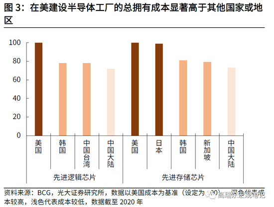 从在美国建设半导体工厂的总拥有成本(TCO)与全球其他地区的对比情况来看,美国半导体工厂生产建设成本的劣势则更为明显。据波士顿咨询公司测算,在综合考虑前期资本开支、生产运营成本和政府补贴的前提下,无论在先进逻辑芯片还是先进存储芯片领域,美国半导体工厂的总拥有成本,相比日本、韩国和新加坡等地普遍高出约20%,相比中国则高出约30%,人力、土地和基础设施等方面的高昂成本,是造成美国半导体工厂成本劣势的重要原因。