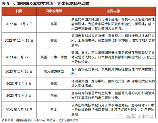 综上所述,我们认为受到内外部多重因素影响,美国仅依靠现有的《芯片法案》相关政策措施,达成构建本土化半导体生态系统,实现维护美国国家安全和经济安全等目标的难度仍然较高。作为美国“小院高墙”对华科技封锁战略的重要组成部分,若《芯片法案》未能达成补足美国半导体产业短板,并加强对华围堵封锁态势的预期效果,则美国也必然通过其他方式加以弥补。我们认为,美国后续的对华半导体竞争策略,预计仍将集中在加强对华技术封锁,以及深化盟友合作关系两个方面,这一思路在此前美国政府官员的公开讲话中也已有所体现。