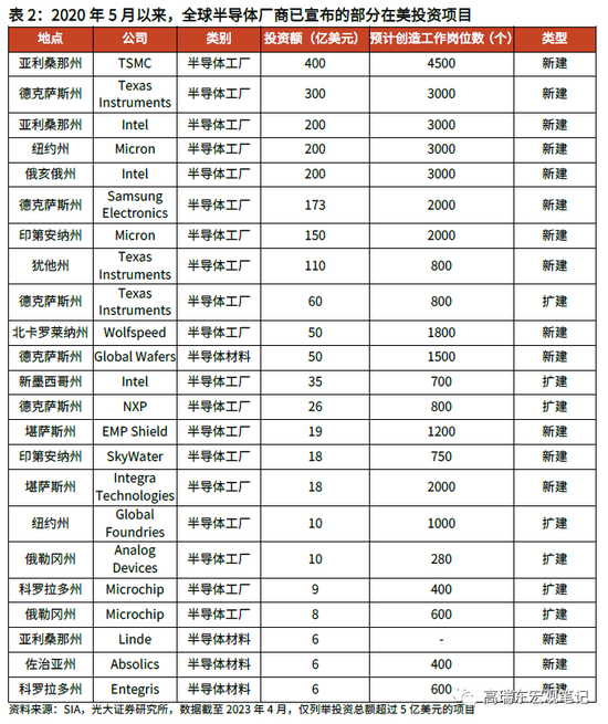 具体成果方面,据美国半导体行业协会(SIA)统计,自2020年5月,《芯片法案》被正式提上议事日程以来(数据截至2023年4月),该法案已经开始发挥吸引在美半导体生产和创新投资的作用:
