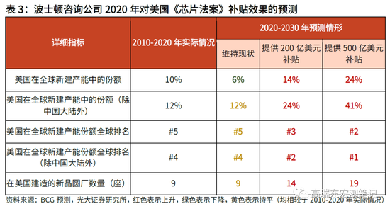 在这一背景下,《芯片法案》提供的各项补贴虽然规模可观,但所能够起到的实际作用,更多在于对冲成本劣势导致的新增产能不足问题,而难以直接使美国获取全球半导体生产的主导地位。据波士顿咨询公司测算,如果不进行大规模产业补贴,美国在2020-2030年全球新增半导体产能中的占比,将从2010-2020年期间的10%下滑至6%。如果进行500亿规模的产业补贴(相当于《芯片法案》实际批准的补贴规模),则前述的美国新增产能占比将大幅上升至24%,若不考虑中国大陆地区新增产能,这一占比将进一步上升至41%。
