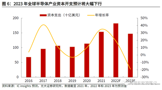 全球半导体产业仍然面临周期下行压力,短期内缩减资本开支成为常态。2023年3月,国际半导体产业协会全球副总裁居龙表示,2023年全球半导体销售额预计将下滑8%-10%,全球半导体设备市场将呈现自2019年以来首次负增长。根据IC insights发布的预测数据,2023年全球半导体产业资本开支也将较2022年水平下滑19%。