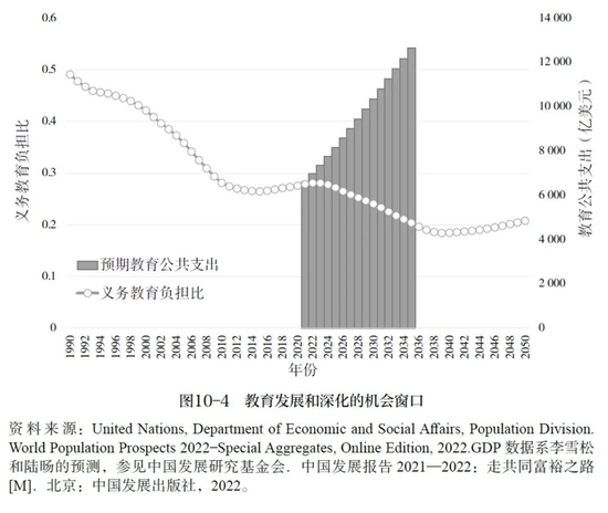 如图10—4所示,2021—2035年,在义务教育负担显著下降的同时,可用于教育的公共支出水平将显著提高。可以说,这个时期是中国教育实现第三次跨越的机会窗口,或者说是创造第二次人口红利的窗口期。
