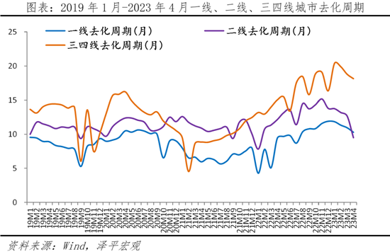 从去化周期看,2023年以来,样本城市去化速度加快、库存压力有所下降,但三四线城市去化周期仍较长。1-4月,19个样本城市去化周期呈持续下降态势,由1月的13.4个月降至4月的10.1个月。其中,一线、二线、三四线城市去化周期分别由1月的11.8、13.7、20.4个月,降至4月10.3、9.5、18.1个月,分别下降1.5、4.2、2.3个月。