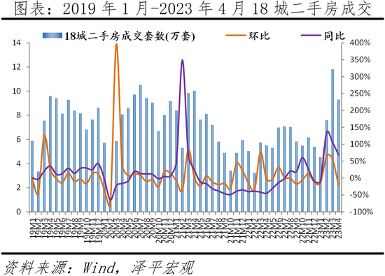 从二手房销售看,一季度二手房销售好于新房,环比增速转正且高于新房,同比增长且超越2019-2021年一季度平均水平,4月环比转负、同比涨幅收窄。
