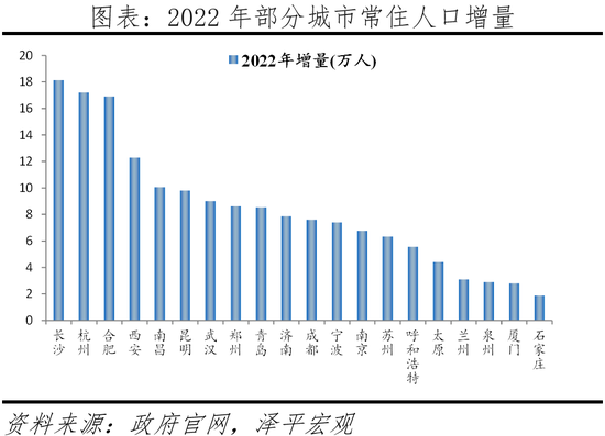 一,需求端,人口总量、结构影响购房需求。近一年常住人口增量排名前五名的城市分别为长沙、杭州、合肥、西安、南昌,人口增量均在10万以上。分结构看,人口较为年轻的城市有深圳、东莞、厦门、佛山、广州、郑州,65岁及以上人口占比不到10%,而南通、烟台、重庆、大连等城市老龄占比超15%。人才净流入量大的城市有北京、上海,虽然两个城市因严控人口导致常住人口增速由正转负,但仍有大量中高端人才净流入。