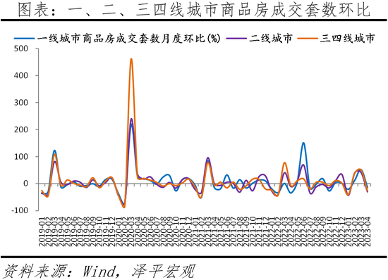 从新房销售看,一季度新房销售筑底复苏,一二线与三四线城市分化,4月环比回落幅度高于往年同期水平、复苏力度变弱。