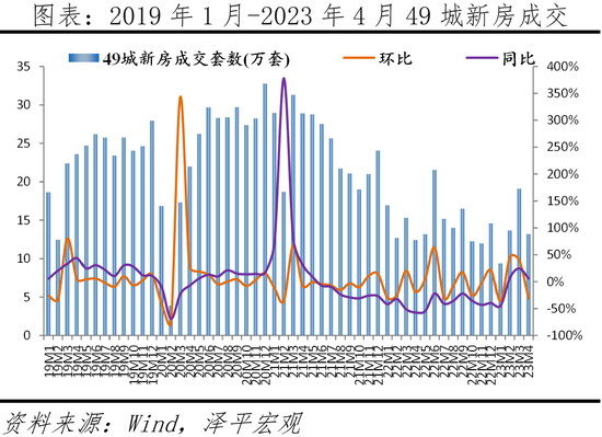 2023年一季度,随着房地产放松政策进一步落地、购房者信心有所恢复、积压的需求集中释放,楼市迎来局部小阳春,销售环比转正、同比显著改善。进入4月,销售环比转负,回落幅度高于2019-2022年同期水平,同比涨幅较3月收窄,复苏进程放缓。