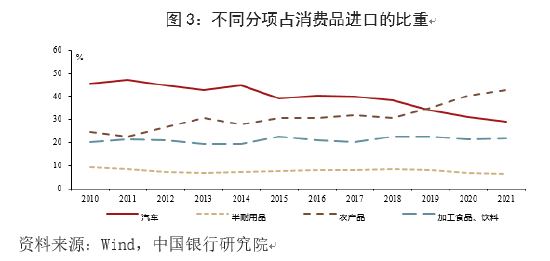 从产品结构来看,我国消费品进口呈分化特点(图3)。一是汽车、半耐用消费品[2]进口占比下降。2010年,汽车占我国消费品进口的比重为45.8%,2021年下降为29%。尤其是2020年“国六”标准实施后,部分进口车因无法满足排放要求而延缓进入我国市场,进口汽车金额下降了9.2%。2010年,半耐用消费品进口占消费品进口的比重为9.3%,2021年下降为6.6%。国产品牌的快速崛起对汽车、半耐用消费品进口产生了较大影响。在同等价格下,国产品牌的配置、质量往往更加优越,这削弱了进口品牌的竞争力。此外,我国消费者消费观念也发生了转变,不再盲目崇尚进口品牌。二是加工食品、饮料占比稳中有升。加工食品、饮料在进口消费品中的比重从2010年的19.7%上升至2021年的21.4%。不同于汽车、半耐用品,在食品领域,我国消费者往往会将“进口”与安全、优质划等号,我国消费者日益注重食品安全,带动食品饮料进口快速增长。三是农产品进口增长较快。2010-2022年,农产品进口金额复合增速为11.4%。其中,粮食是主要进口农产品品类,2022年粮食进口占农产品进口的34.94%。农产品进口增长加快的主要原因在于:农产品的工业、医疗等用途日益丰富,加之我国14亿人口的消费需求日趋多元,农产品需求稳步扩大。同时,为缓解我国农业生产所面临的资源压力,近年来我国政府对农产品进口采取适度扩大的战略,带动农产品进口增速提升。